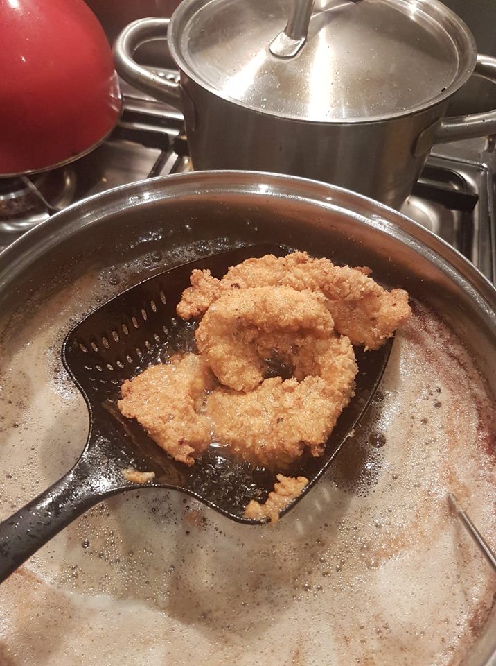 Husk at holde øje med temperaturen! Temperaturen i gryden skal helst ligge på mellem 165 og 175 grader, og det er derfor vigtigt, at du har et madtermometer i gryden, så du kan holde øje med varmeudviklingen. Det er vigtigt at olien ikke koger over.