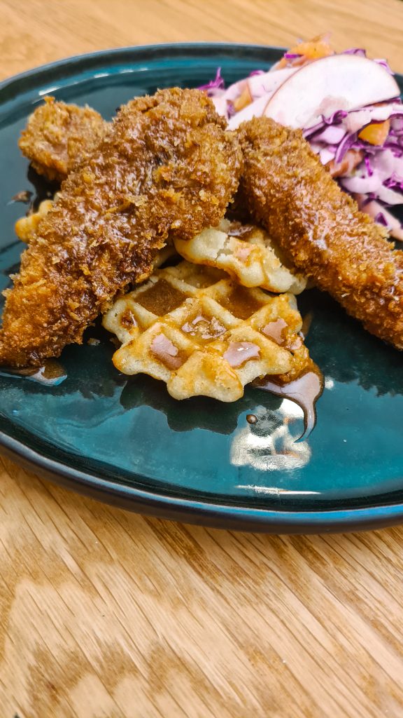 Skal det være ekstra lækkert, så server kyllingen oven på vafler - du finder en fantastisk opskrift på vafler i vores vaffelburger-opskrift her: https://www.eatmysports.dk/opskrifter/vaffelburgeren-den-er-bar-laekker/